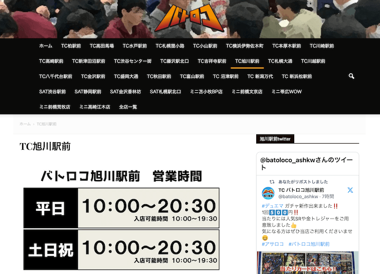 | 業者名 | 1.トレトク | 2.王の洞窟 | 3.ウリウリトレカ | 4.ホビーオフ旭川西店 | 5.カードショップ宝島 神居店 | 6.カードショップさんれっど | 7.バトロコ旭川駅前 | 8.なんでもリサイクルビッグバン 旭川宮前店 |