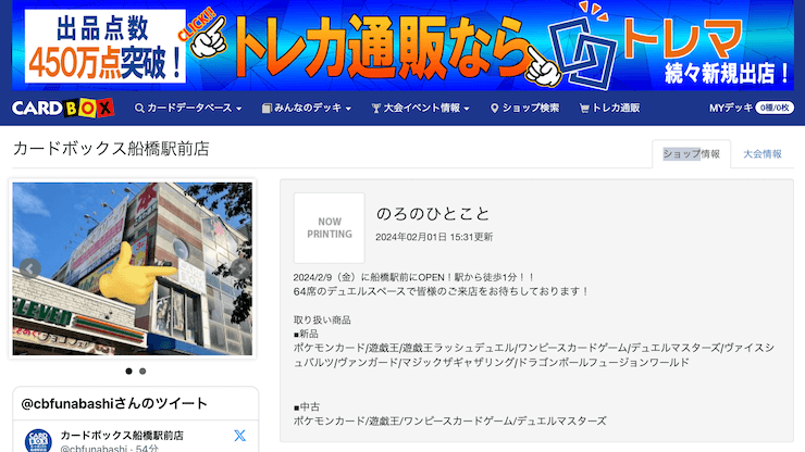 | 業者名 | 1.トレトク | 2.王の洞窟 | 3.ウリウリトレカ | 4.WAKABAエポカ高根台店 | 5.BOOKOFF SUPER BAZAAR ビビット南船橋店 | 6.ブックスエーツー中山店 | 7.千葉鑑定団船橋店 | 8.桃太郎王国西船橋店 | 9.ふるいちイオンモール船橋店 | 10.カードボックス船橋駅前店 |